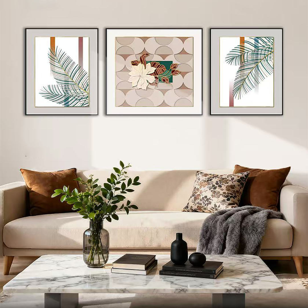 This rectangular decorative wall artwork adds a refined and contemporary touch to living rooms and home interiors. Its clean lines and balanced design enhance the overall ambiance of modern spaces.